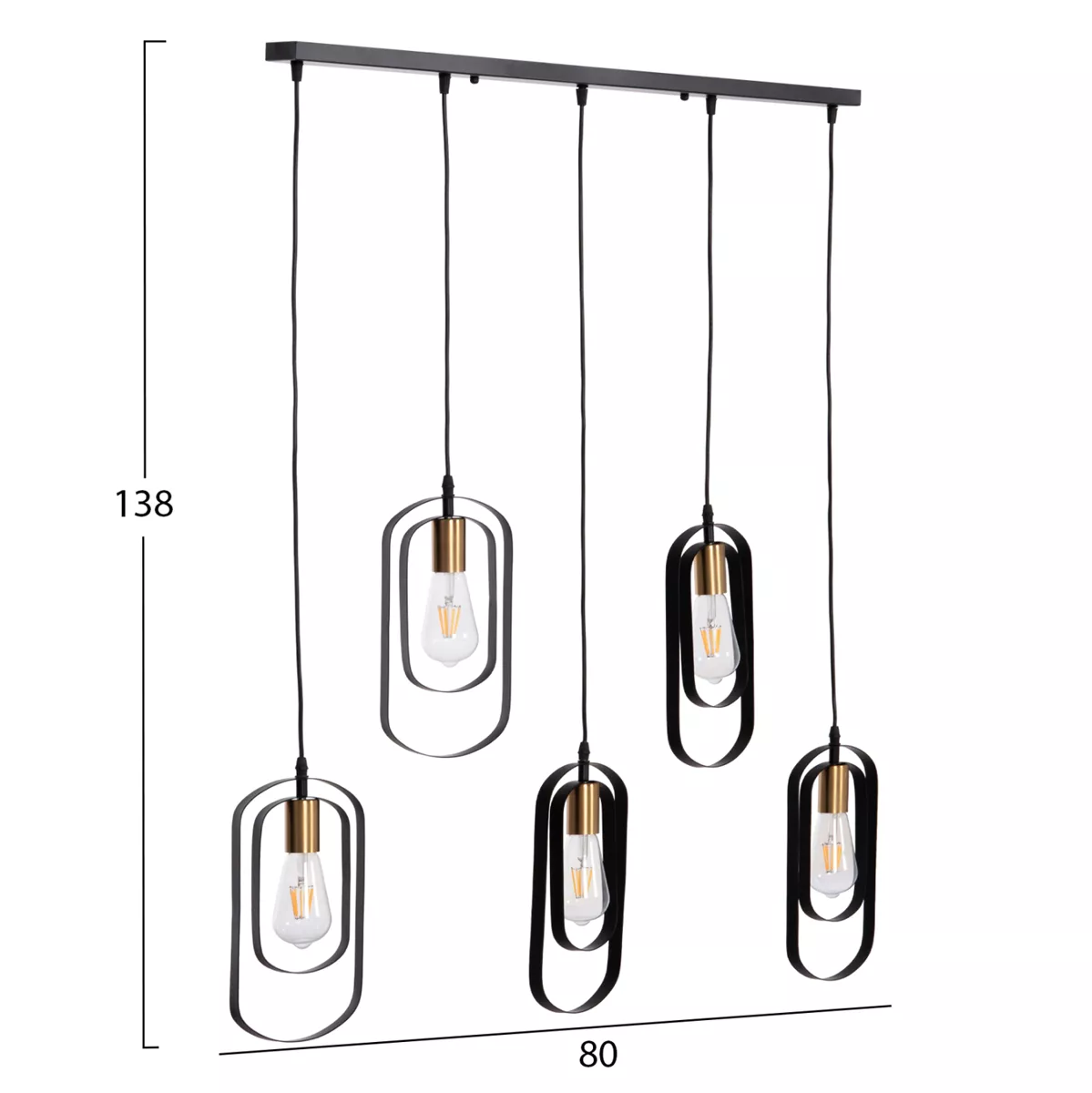 The BIUT pendant ceiling lamp is a 5-light pendant in different alternating heights with a rectangular black ceiling base and black hanging cables. The bulbs are placed in gold-colored sockets while what catches the eye is the minimal design of the “caps” with the two metal frames.
