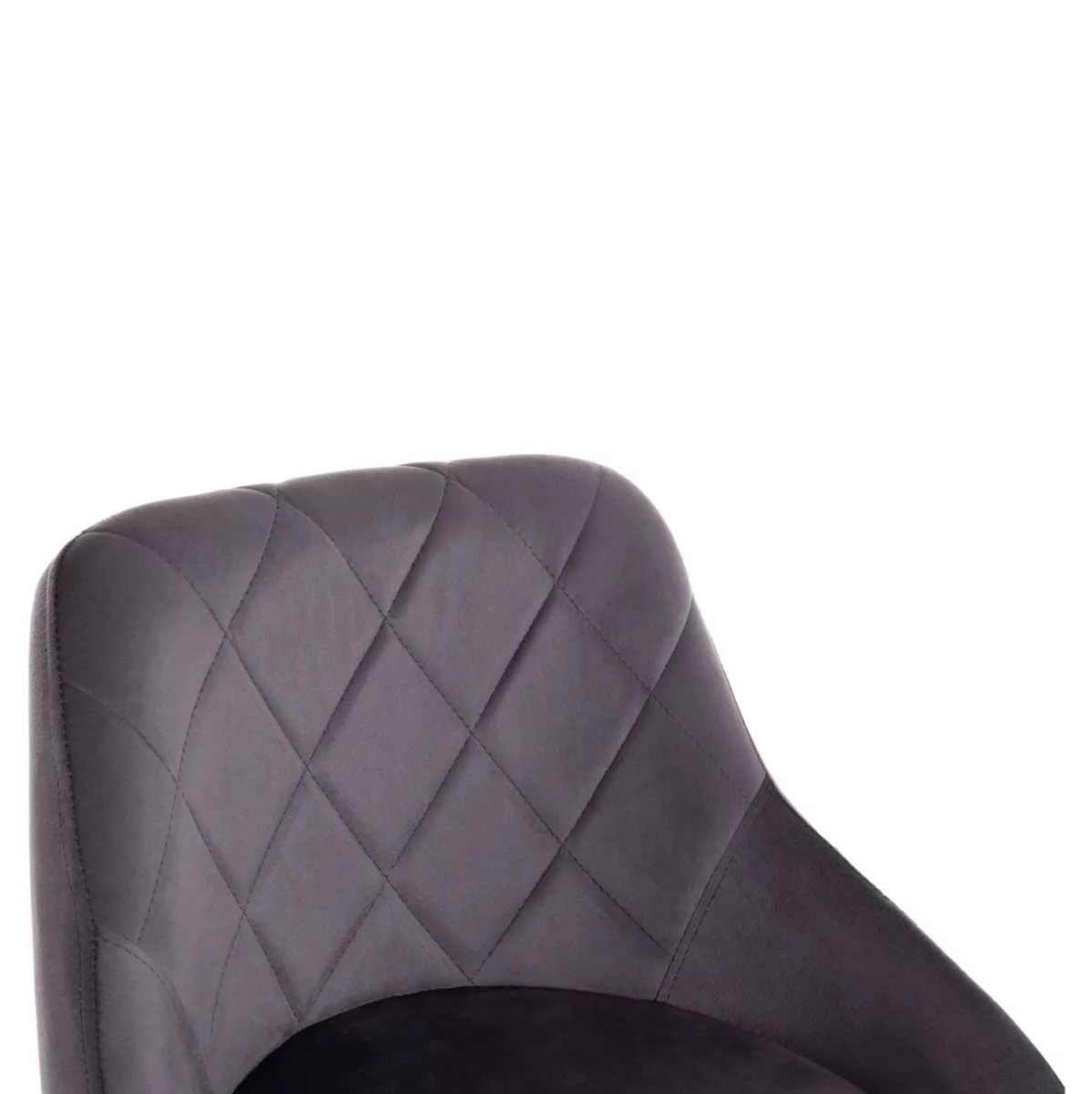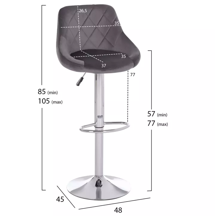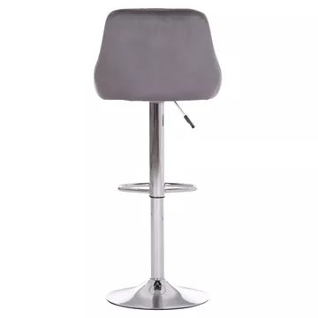 Meet ROSE. A GREY velvet bar stool that has everything you would ever want from such a piece of furniture. ROSE is simple, of really high quality and elegant in appearance, and it is sure to catch the eye. It is swiveling, it is high with a medium back, and the back has a quilted design, which adds to the special character of this stool. But the good things don't stop there! The chromed metal column of the stool also has a semi-circular footrest and ends in a beautiful wide disc that provides support and balance. The special feature is the existence of a suspension for adjusting the height of the seat with an elegant lever under the seat.