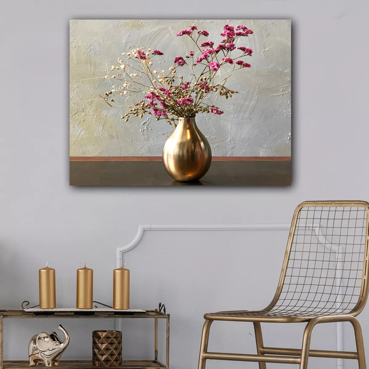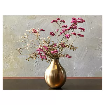 A wall painting transforms the way we perceive space. So, decorate your space with the new GOBI wall painting series! This beautiful colorful painting depicts a golden vase with flowers and has been implemented on printed canvas with a wooden frame.