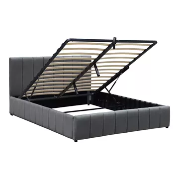 The bed features an easy-to-use mattress lift mechanism, which reveals a spacious storage area underneath. This makes it exceptionally easy to organize linens, pillows, out-of-season clothing, or other items, effectively contributing to the organization and tidiness of the space.