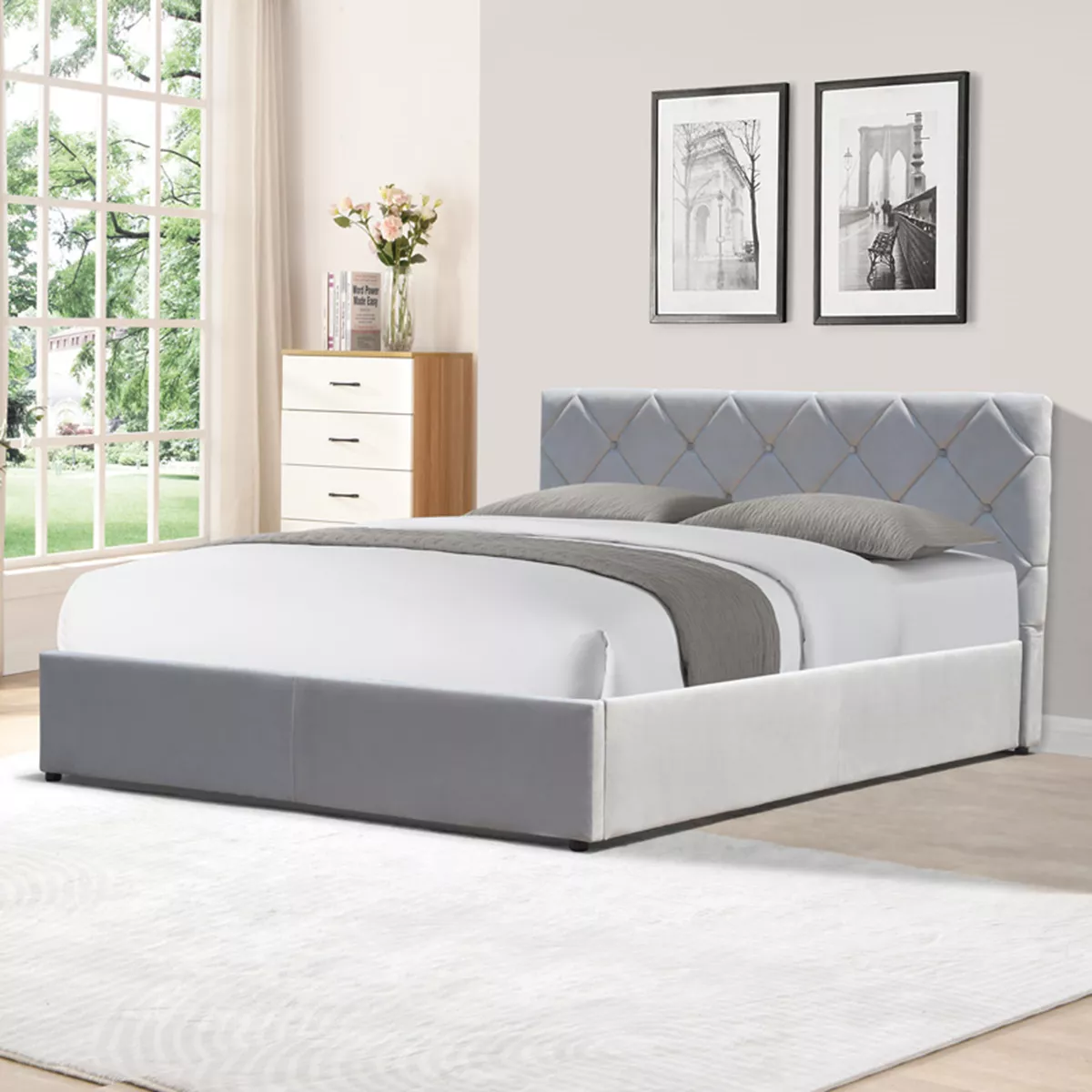 Dreamie Bed with StorageThe elegant and functional Dreamie bed offers a smart storage solution, as it features an easy-to-use mattress lift mechanism, revealing a spacious storage area underneath. The headboard, with its timeless quilted design, adds a touch of luxury and comfort, while its color scheme makes it versatile and compatible with all decor styles.