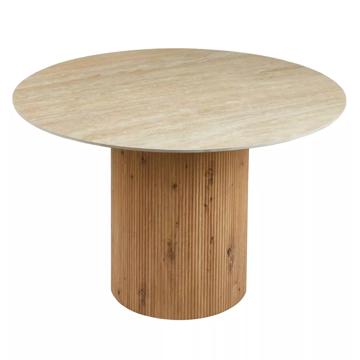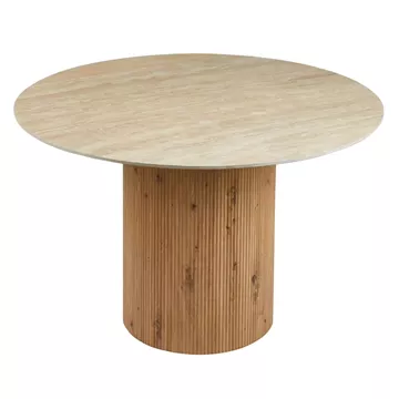 The TWIL dining table is round and constitutes a new addition to our range of products. Its flat tabletop is ceramic in TRAVERTINE STONE coloring, while its cylindrical base is made entirely of MDF in natural wood color, with beautiful pleats (corrugated).