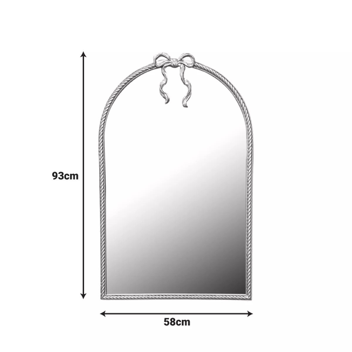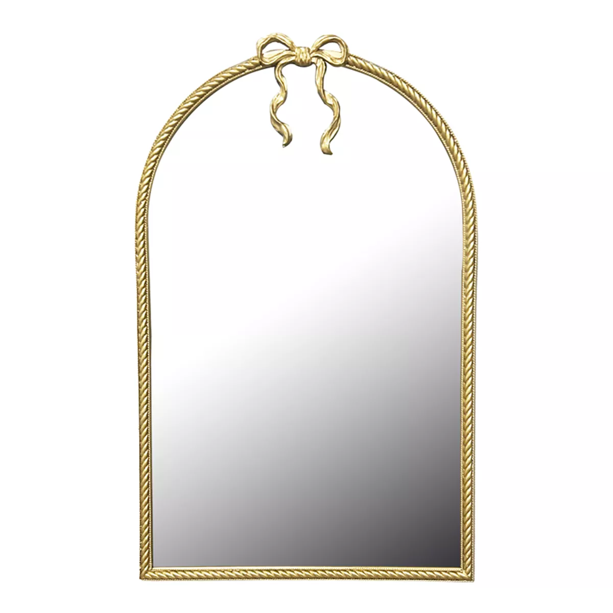Bring a touch of romantic elegance and grandeur to your space with this beautiful arched wall mirror. The ornate golden frame and the subtle bow detail at the top add timeless finesse and an aristocratic charm.