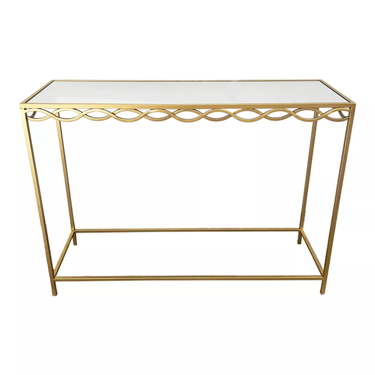 Enhance every corner of your home with this contemporary metal console table—a piece that perfectly blends functionality with style. Its durable metal frame provides a sense of sturdiness and modern design, while the mirrored surface is not only visually appealing but also smartly designed: it reflects light, creating a sense of spaciousness and brightness, making the area feel larger and more inviting.