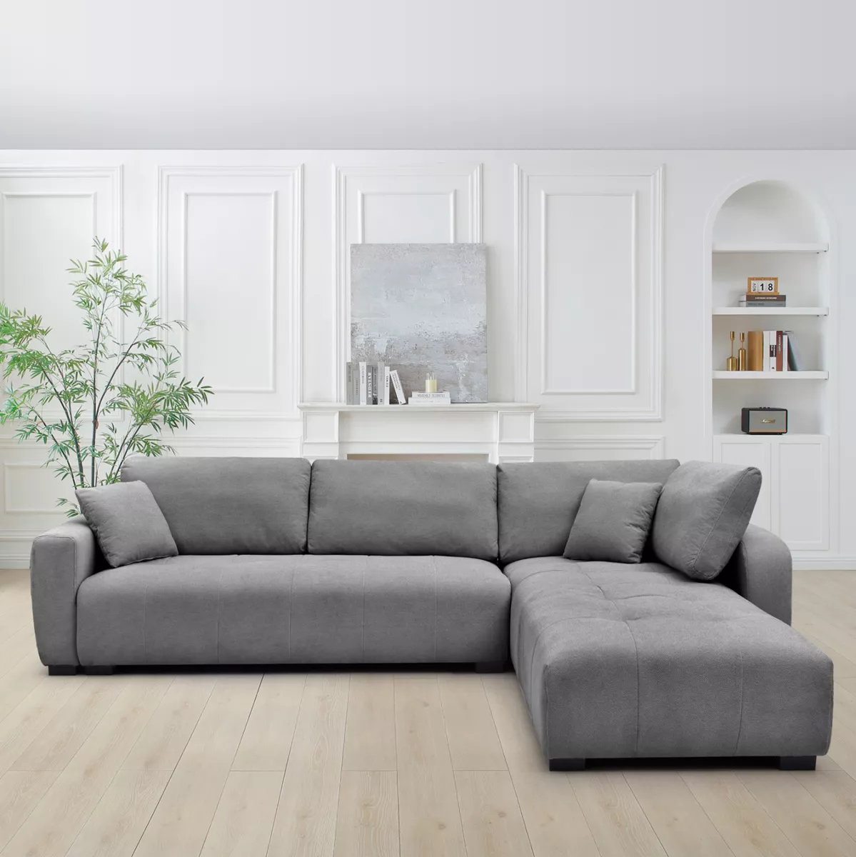 MEDEL is a convenient and practical corner sofa. The color of the upholstery of the entire sofa is GREY, as are the two decorative cushions. It is upholstered in excellent quality polyester fabric, while the seat of the sofa has pocket springs, which offers unique body support and unparalleled comfort. And because the sofa can be set up either in a left or right corner, its usefulness and functionality go beyond the usual. Finally, the legs of the sofa are wide and low, giving solidity to the entire structure.