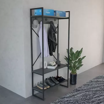 Designed to meet all your everyday needs, this piece of furniture offers a complete storage solution. Hang coats, scarves, and bags on the integrated hooks, neatly arrange your shoes on the bottom shelf, and use the upper shelves to add a personal touch with decorative items or books.