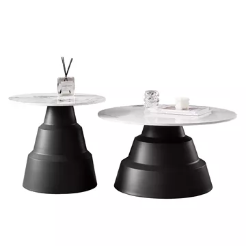 This set consists of 2 round metal coffee tables of different sizes. Their bases are graded cone-shaped in BLACK color, while the tabletops are made of glossy sintered stone in a “SNOW WHITE” color scheme. Ideal for both home and professional spaces.