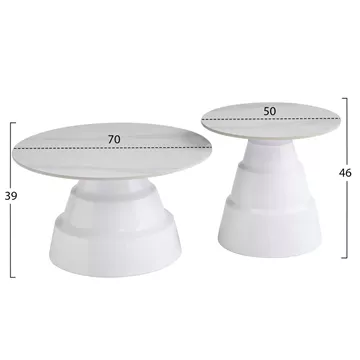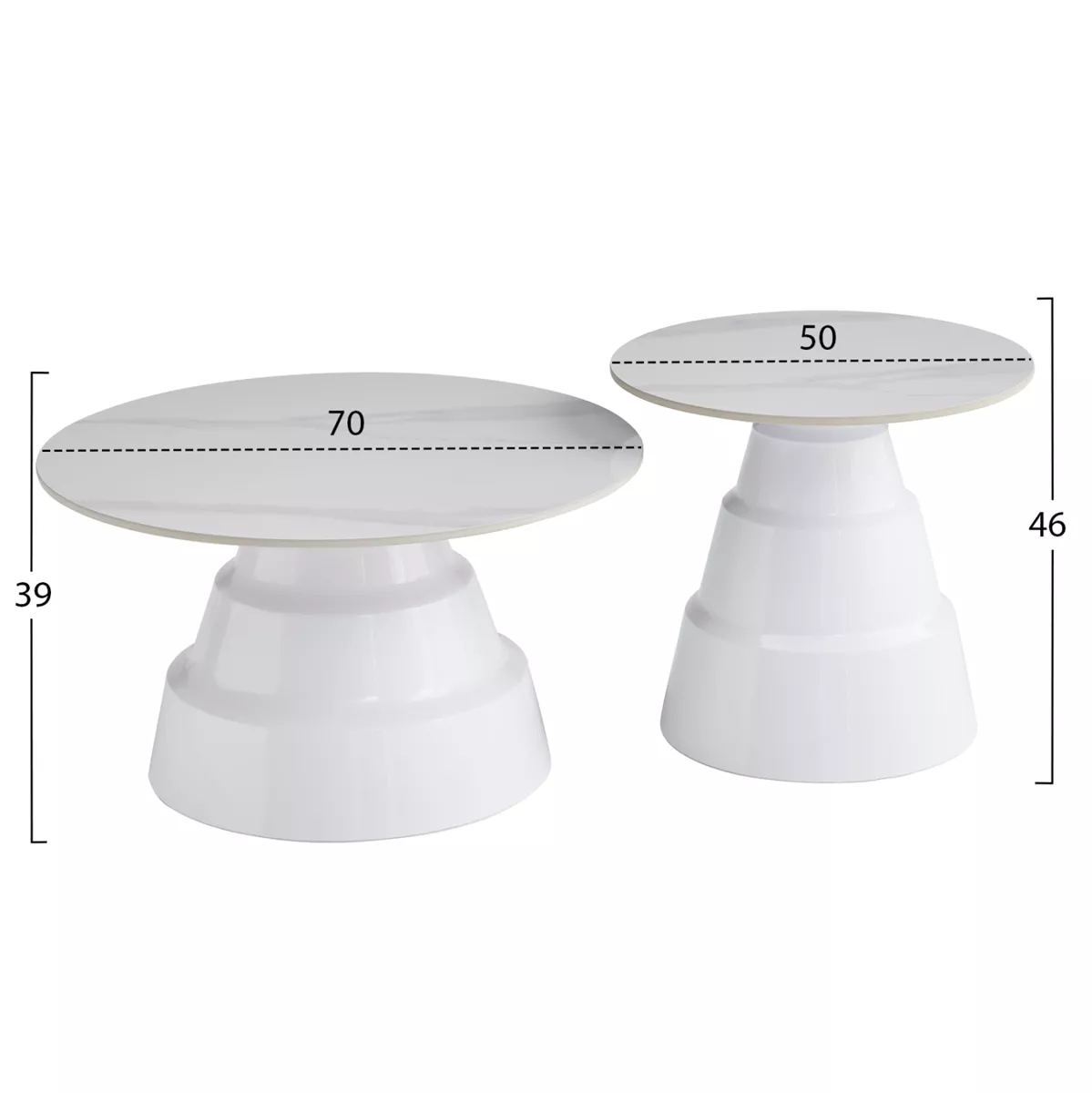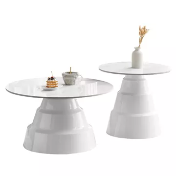 This set consists of 2 round metal coffee tables of different sizes. Their bases are graded cone-shaped in glossy WHITE color, while the tabletops are made of glossy sintered stone in a “SNOW WHITE” color scheme. Ideal for both home and professional spaces.