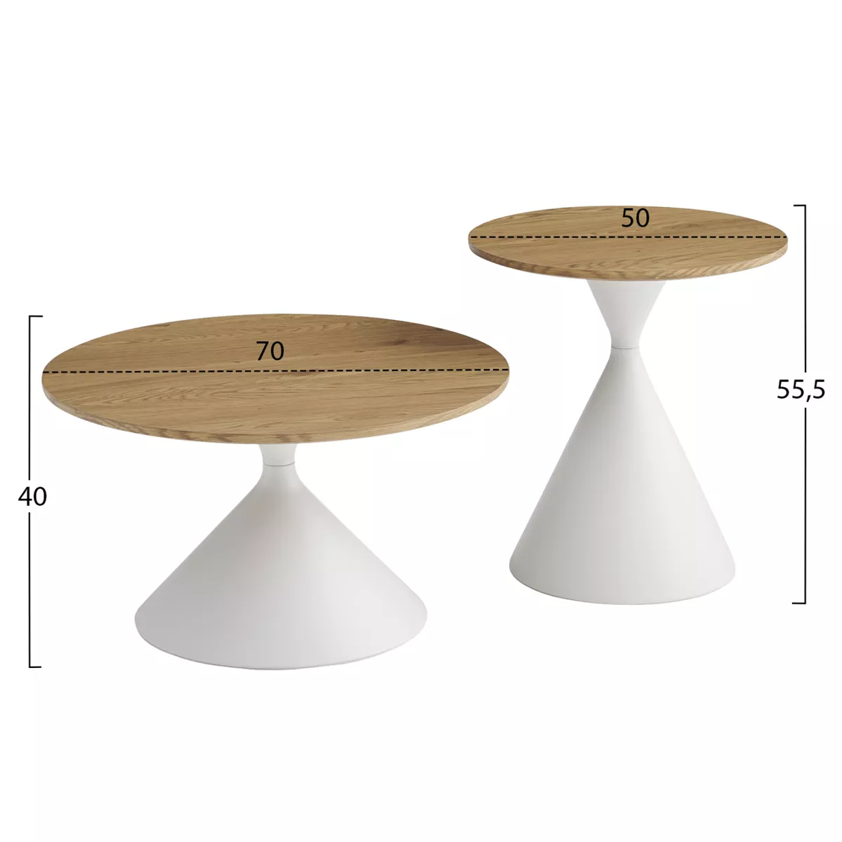 This set consists of 2 round metal coffee tables of different sizes. Their bases are hourglass shaped in matte WHITE color, while the tabletops are made of MDF in NATURAL wood color. Ideal for both home and professional spaces.