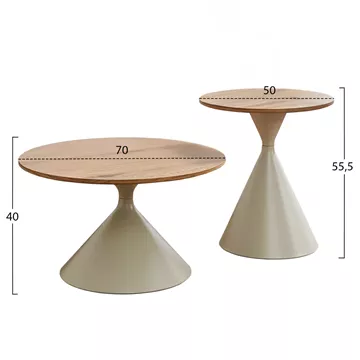 This set consists of 2 round metal coffee tables of different sizes. Their bases are hourglass shaped in CHAMPAGNE color, while the tabletops are made of MDF in NATURAL wood color. Ideal for both home and professional spaces.