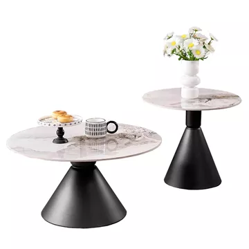 This set consists of 2 round metal coffee tables of different sizes. Their bases are cone-shaped in BLACK color, while the tabletops are made of glossy sintered stone in a “pandora” color scheme. Ideal for both home and professional spaces.