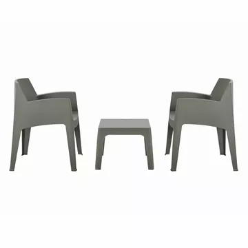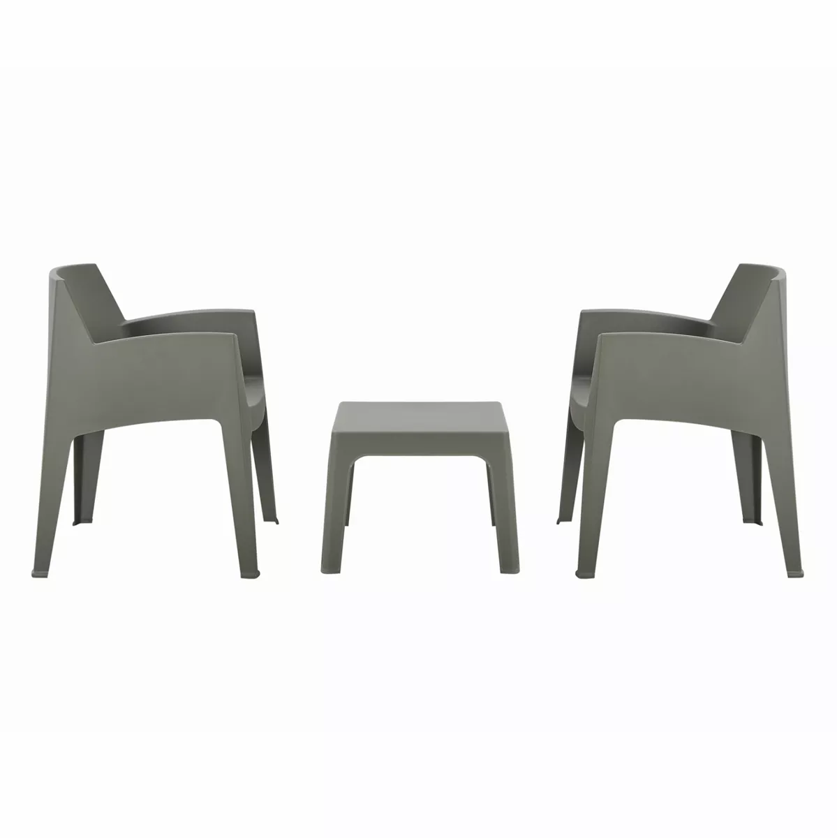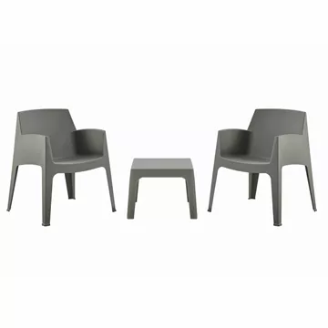 A square coffee table and 2 stackable armchairs, which are entirely made of polypropylene in DARK OLIVE GREEN color. In terms of design, it is simple and can be used in many ways, offering practical and durable use. Ideal for use in outdoor spaces, either professional (banquet venues, catering companies, etc.) or for the home.