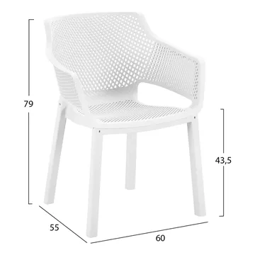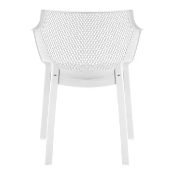 The “PEGGY” polypropylene armchair in WHITE is a classic choice for outdoor use, either professional since it is STACKABLE (banquet halls, catering companies, etc.) or for the home. It consists of a molded "perforated" seat-back-armrest assembly for better ventilation.