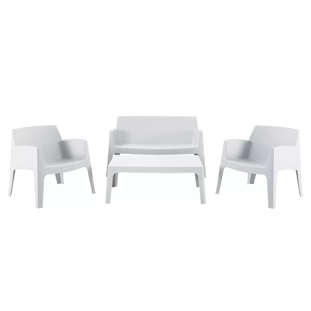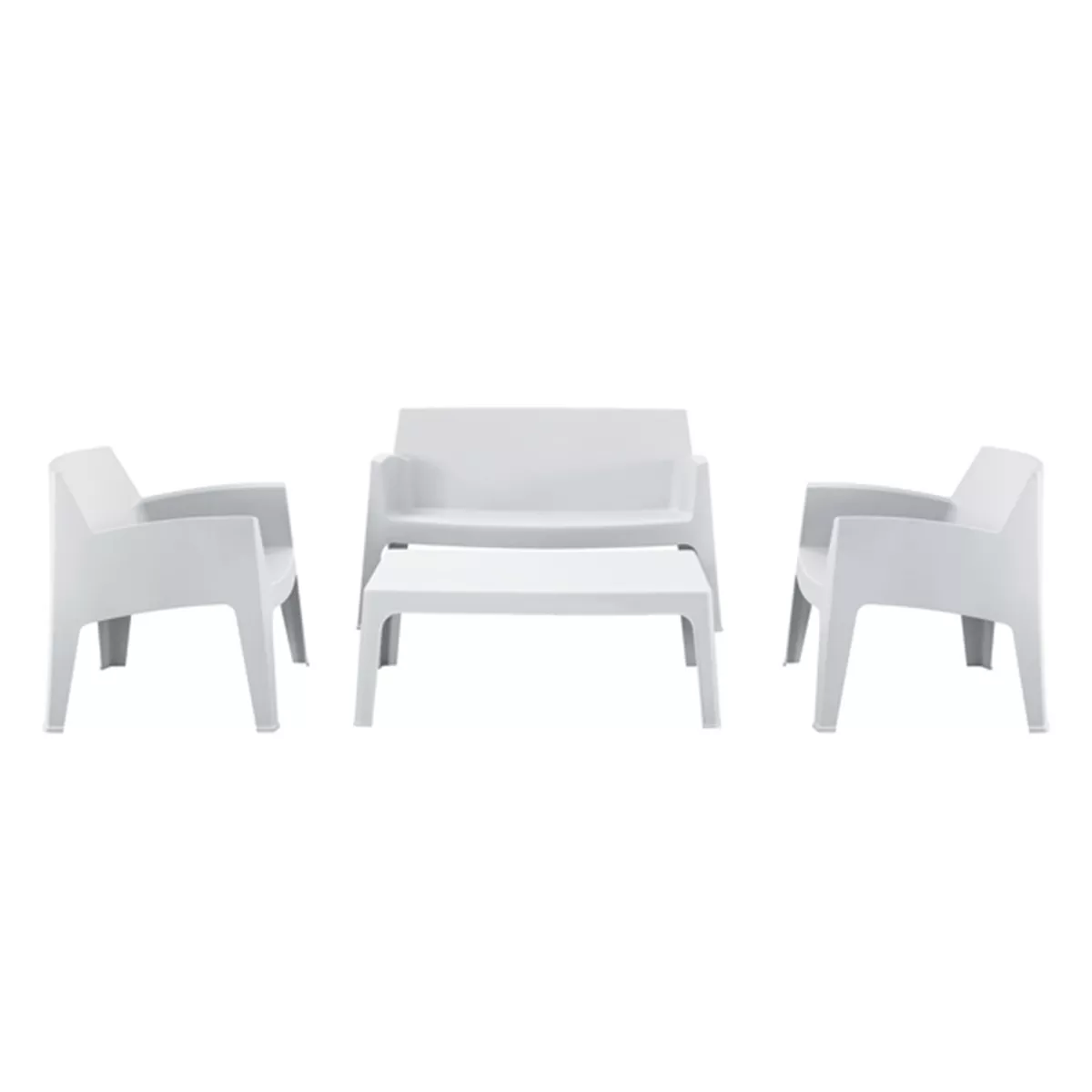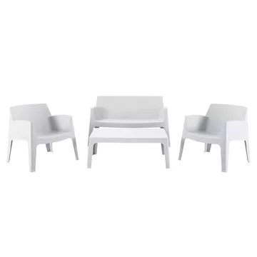 A rectangular coffee table, 2 stackable armchairs and a 2-seater sofa, which are entirely made of polypropylene in WHITE color. In terms of design, it is simple and can be used in many ways, offering practical and durable use. Ideal for use in outdoor spaces, either professional (banquet venues, catering companies, etc.) or for the home.