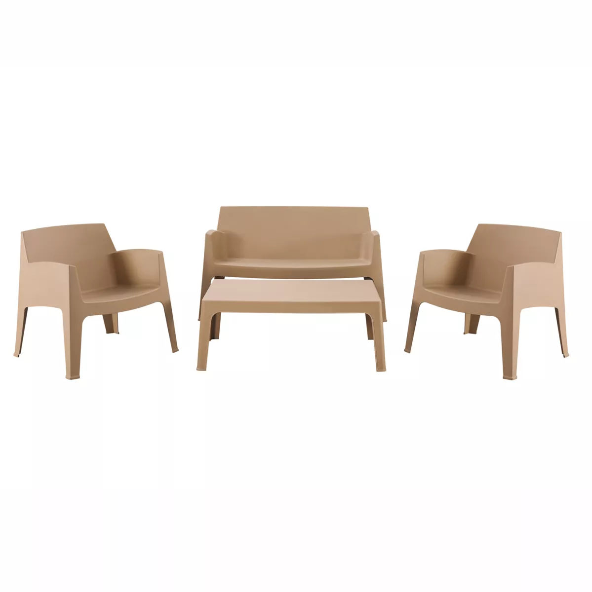 A rectangular coffee table, 2 stackable armchairs and a 2-seater sofa, which are entirely made of polypropylene in CAPPUCCINO color. In terms of design, it is simple and can be used in many ways, offering practical and durable use. Ideal for use in outdoor spaces, either professional (banquet venues, catering companies, etc.) or for the home.
