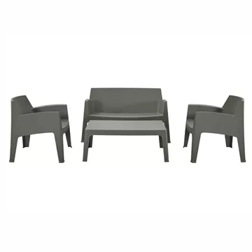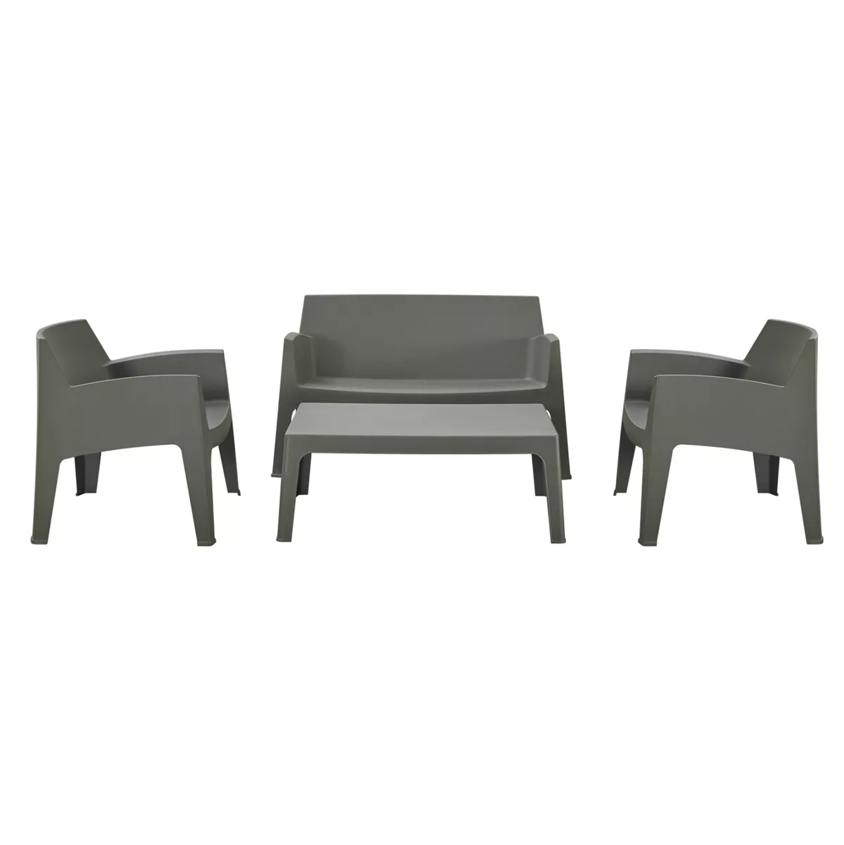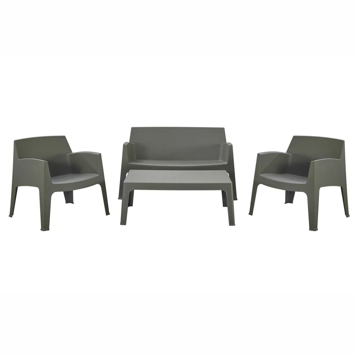 A rectangular coffee table, 2 stackable armchairs and a 2-seater sofa, which are entirely made of polypropylene in DARK OLIVE GREEN color. In terms of design, it is simple and can be used in many ways, offering practical and durable use. Ideal for use in outdoor spaces, either professional (banquet venues, catering companies, etc.) or for the home.