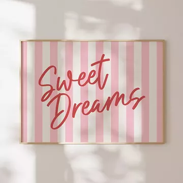 Create a dreamy and chic atmosphere, perfect for the bedroom, nursery, or child’s room, with the sweet Sweete wall art. This piece features the message "Sweet Dreams" in soft pink lettering on a background of pink and white stripes. It is the perfect addition to bring a touch of Hygge and romantic style to your space.