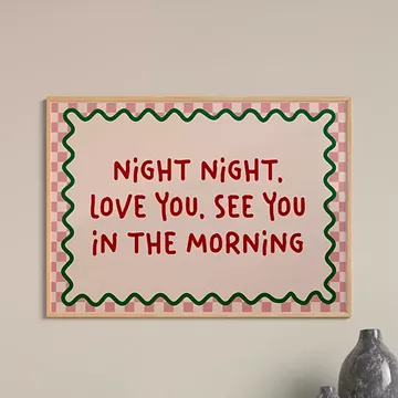 The Tharis wall art is a sweet and tender decorative piece, perfect for adorning a bedroom, nursery, or relaxation space. The print features a charming “Good Night” in red letters, framed by a playful, wavy outline in green and pink.