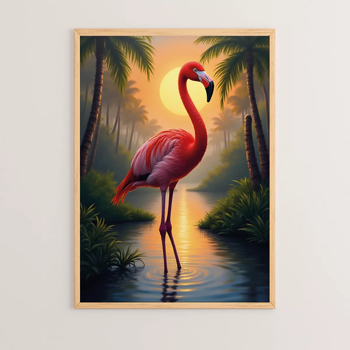 Create an exotic and dreamy atmosphere in your space with this stunning Buka painting, depicting a majestic flamingo against a tropical sunset. The vibrant, intense pink hues of the flamingo contrast beautifully with dark palm trees and golden light, creating a warm and elegant ambiance.