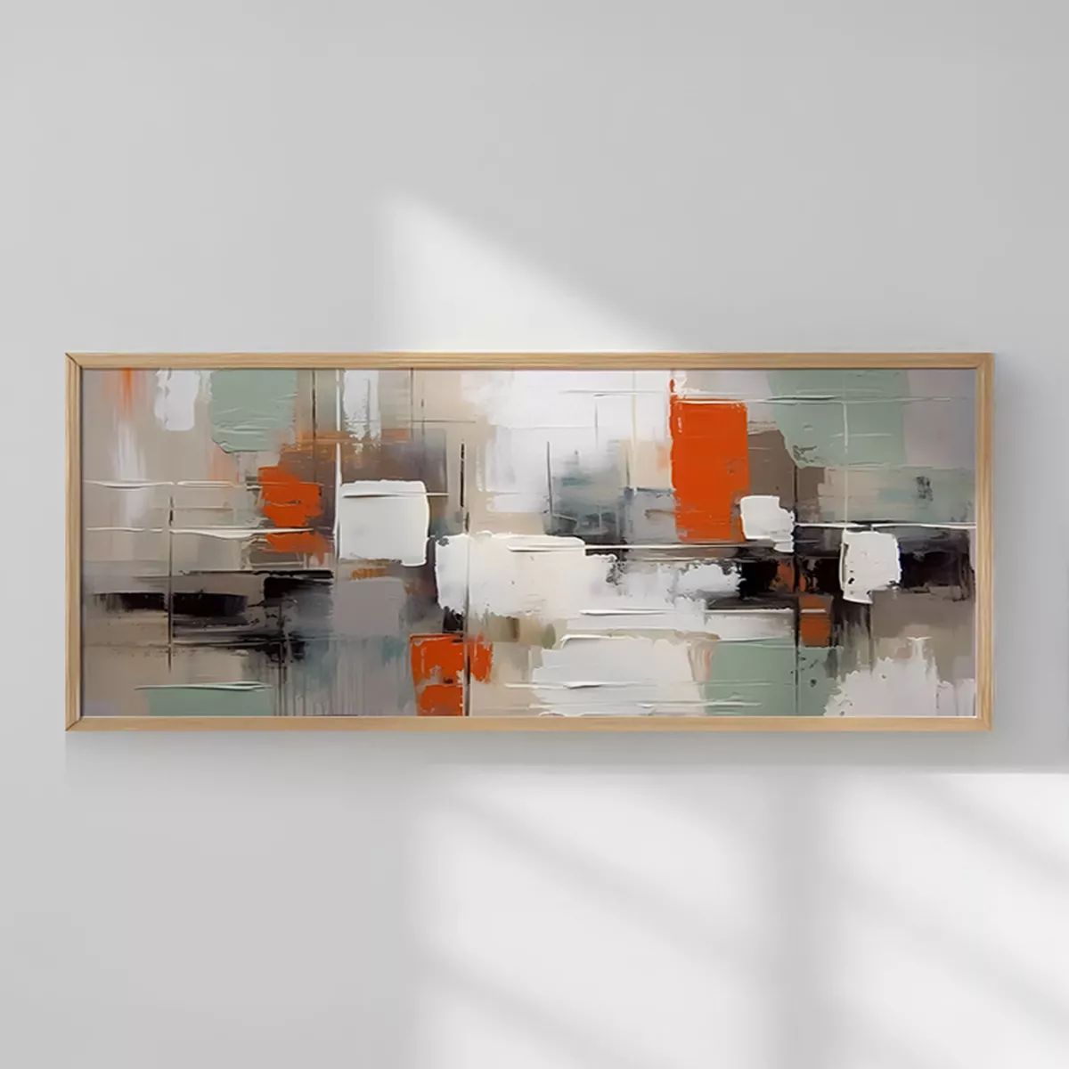 The abstract composition, featuring alternating color blocks and visible brushstrokes, creates a piece that is both modern and timeless.