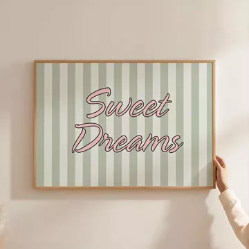 Create a relaxing and dreamy atmosphere with the Deremy wall art, perfect for a child’s room or bedroom. This piece features the message "Sweet Dreams" in soft pink lettering on a background of mint green and white stripes, adding a touch of Hygge and Scandi style to your space.