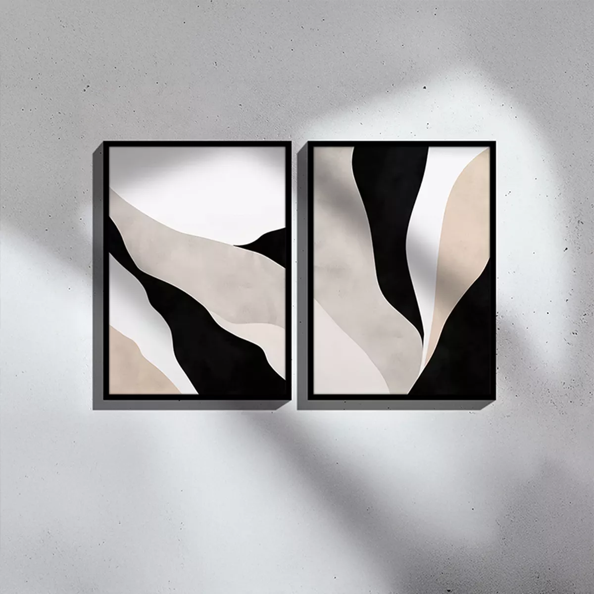 Introduce refined movement and subtle contrast into your space, framed by a modern black border. The Manua I diptych features dynamic, wavy lines and shapes in overlapping layers. The black frame surrounds the neutral palette, enhancing the intensity and clarity of the composition.