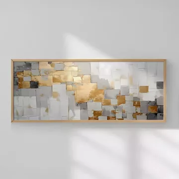 Small and large squares and rectangles — like colorful mosaics — are scattered across the surface, creating the impression of an urban landscape or a modern architectural composition in constant transformation. The arrangement conveys intensity, movement, and visual intrigue, inviting the eye to explore every detail.
