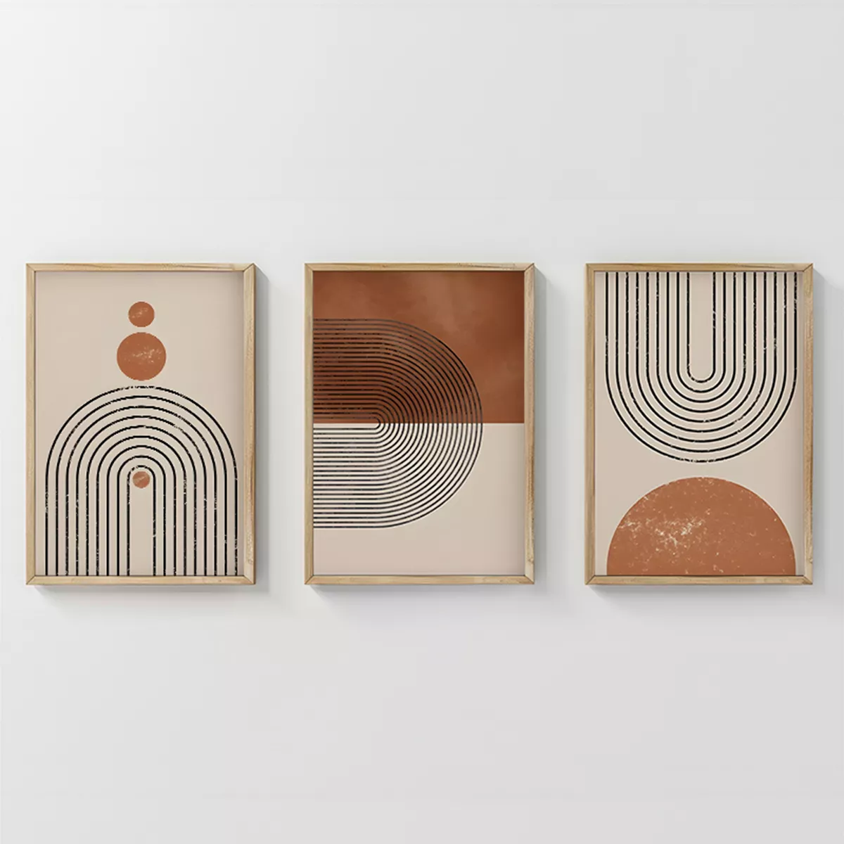 Bring into your space a work that combines the precision of lines with the warmth of terracotta, creating a dynamic, modern effect. The Herela triptych is an aesthetic statement consisting of three distinct, interrelated pieces. Each panel features abstract geometric elements — mainly arches and semicircles — adding depth, dynamism, and refined aesthetics to your interior.