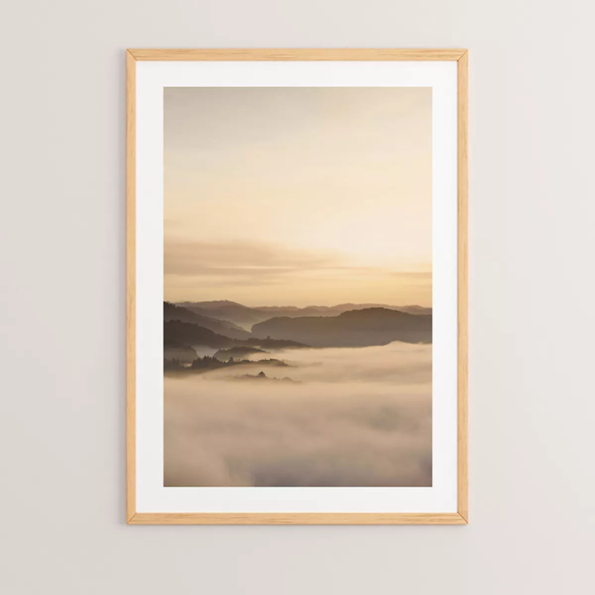 Surrender to the charm of a painting that captures the unique spectacle of a landscape immersed in mist. The photograph conveys the feeling of early morning, with hills emerging through a soft, foggy veil that blankets the valley, creating a play of light and shadow that touches the heart.
