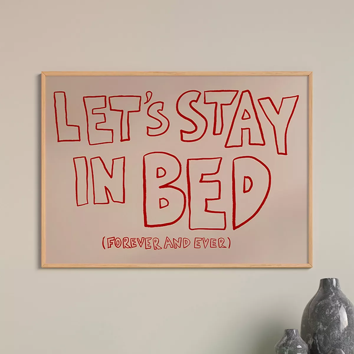Bring a playful and lyrical vibe to your space, perfect for the bedroom, with the rebellious Slepery wall art. This piece features the message "LET'S STAY IN BED" in bold red lettering on a soft pink background. It’s the perfect statement piece for those who cherish cozy moments and the comfort of home.