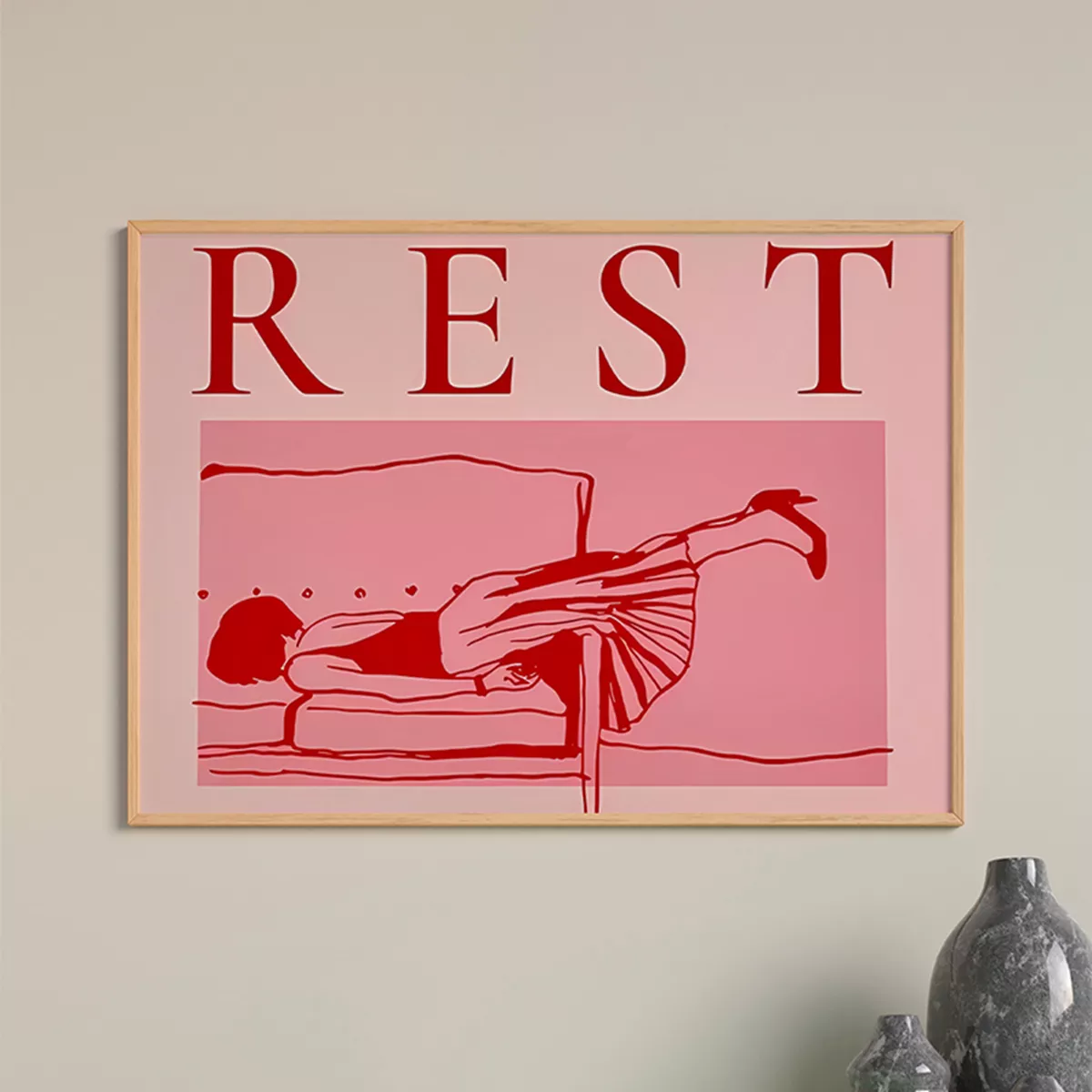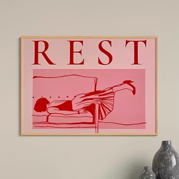 Add a bold and satirical touch to your space with the provocative Restika wall art. This piece features the message "R E S T" in dramatic burgundy lettering over the depiction of a person relaxing, set against an intense pink color palette. It is the perfect statement piece for the living room, office, or bedroom, combining Pop Art aesthetics with a powerful, humorous message.
