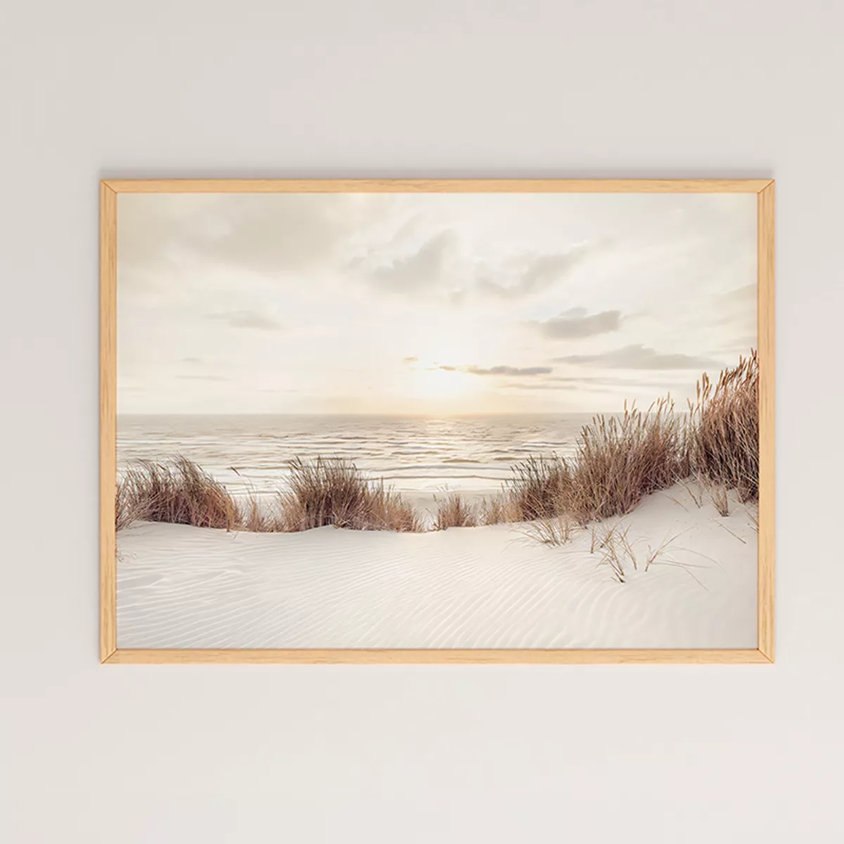 The photograph captures a peaceful seaside landscape with sand dunes and dried grasses, evoking a sense of relaxation and warmth.