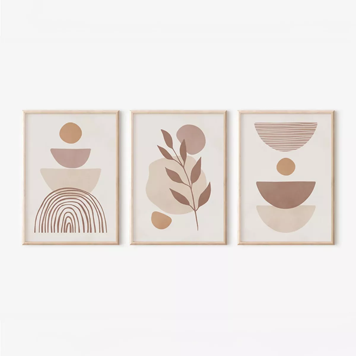 Binbia Triptych is the perfect piece to bring a minimalist, chic, and calm character to your walls. This three-piece composition, enhanced with high-resolution digital prints, features abstract motifs with delicate line art and multi-layered geometric forms in an exceptionally soft palette of nude and light earthy tones. Through their harmonious arrangement, they create a subtle, balanced visual rhythm and a striking aesthetic statement.