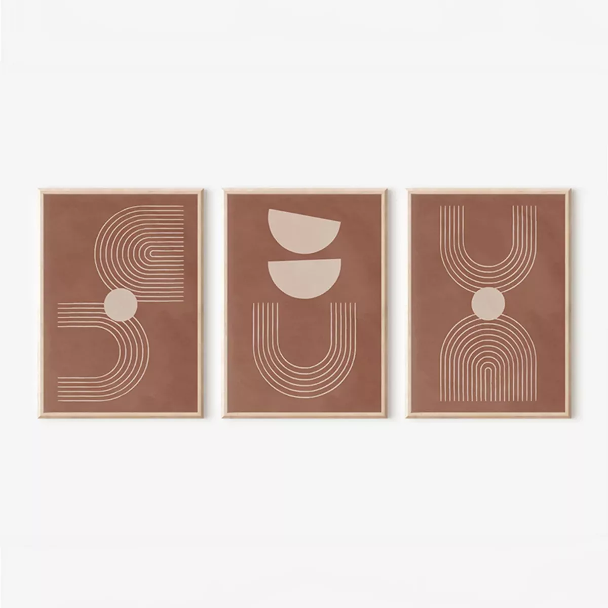 Banba Triptych is the perfect piece to bring a boho-minimalist, artistic character to your walls. This three-piece composition, enhanced with high-resolution digital prints, features abstract patterns with geometric shapes and delicate lines in a striking, monochromatic warm brown palette. Through their harmonious interaction, they create a subtle visual rhythm and a bold aesthetic statement.