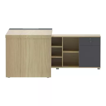 Side desk: Attached to the right side and supported by a cabinet featuring multiple storage options: a lockable drawer, a cupboard, and shelves. All components are made from high-quality chipboard with a melamine coating.