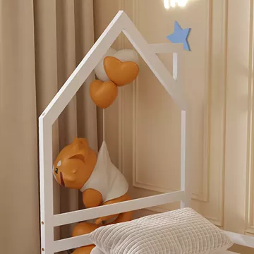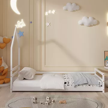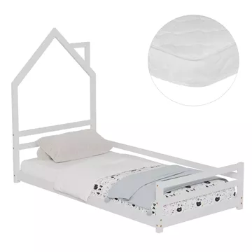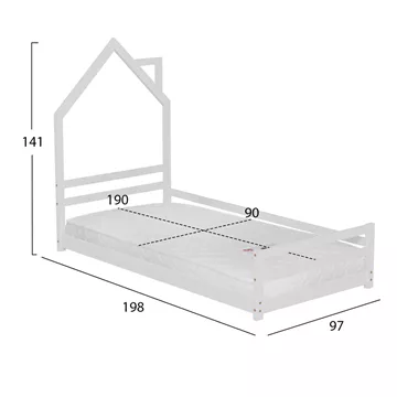 The HOUSER Montessori-type children's bed in dimensions for a mattress of 90x190cm, is made of pine wood in WHITE color. The headboard is shaped like a house with a chimney, and the legs are extremely low, while the mattress is placed on plywood boards.