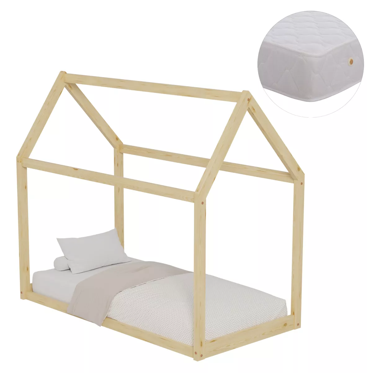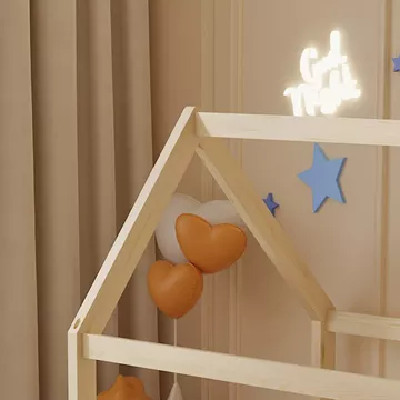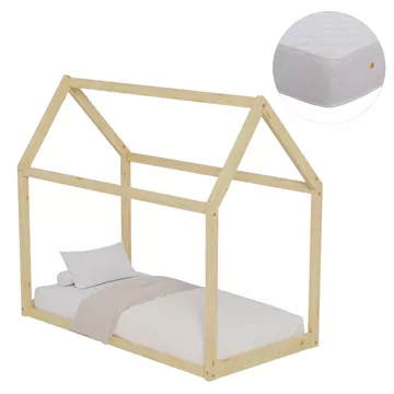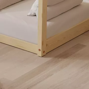 The PEPE Montessori-type small children's bed in dimensions for a mattress of 70x140cm, is made of pine wood in NATURAL wood color. The whole bed is shaped like a house and “rests” directly on the floor, while the mattress is placed on plywood boards.
