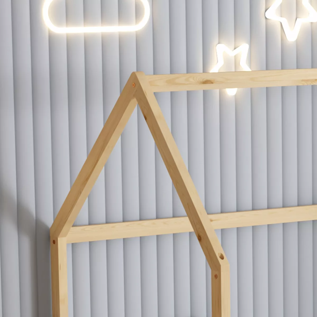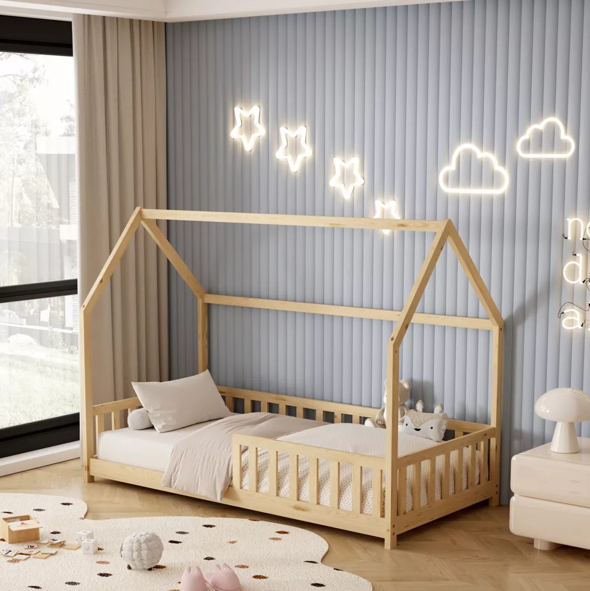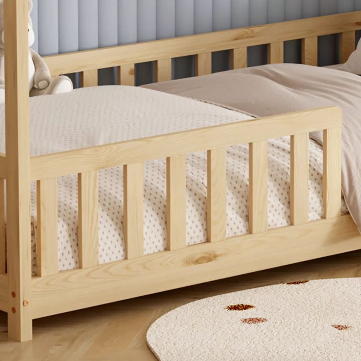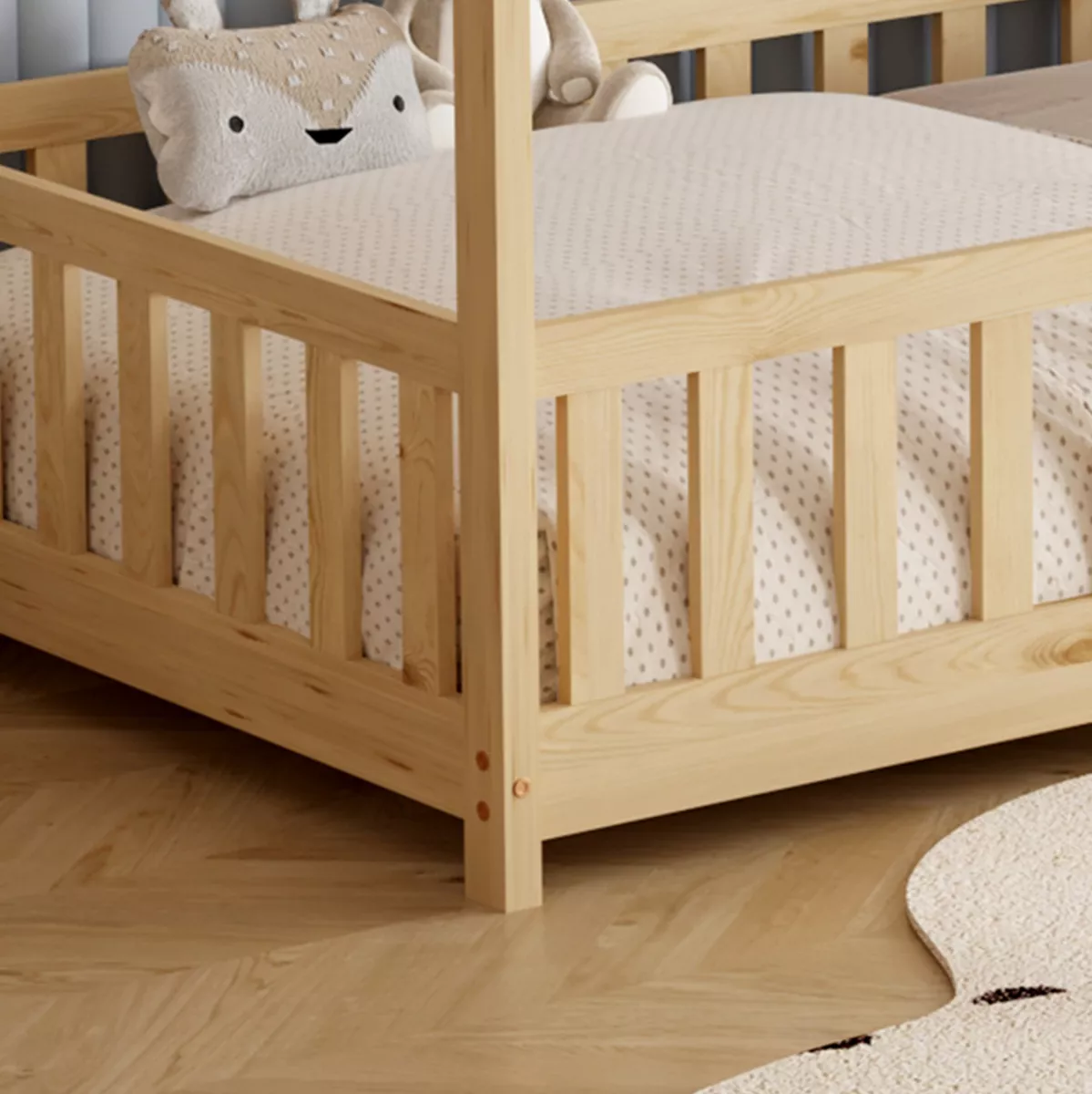 The PHYLLIS Montessori-type children's bed in dimensions for a mattress of 90x190cm, is made of pine wood in NATURAL wood color. The whole bed is shaped like a house with extremely low legs and features wooden railing around the perimeter, while the mattress is placed on plywood boards.