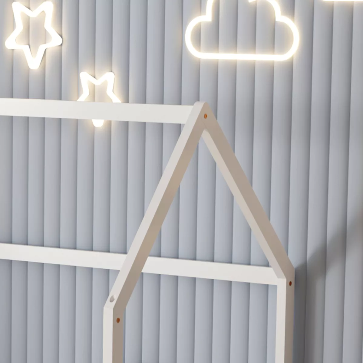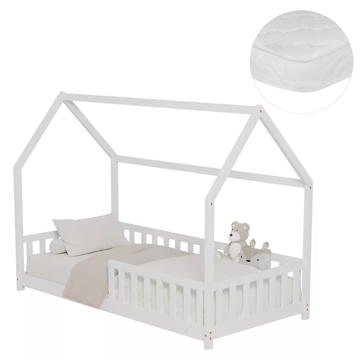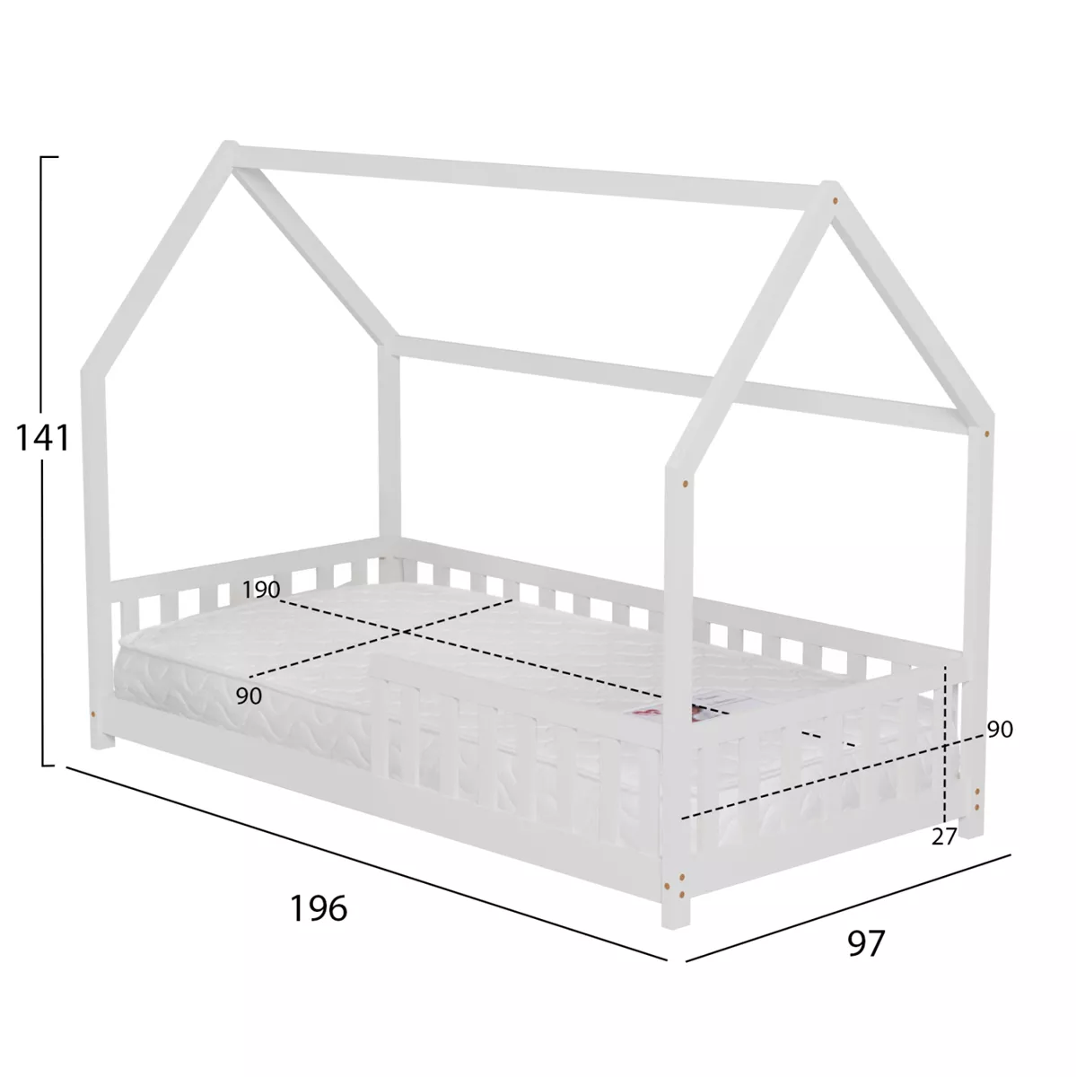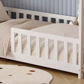 The PHYLLIS Montessori-type children's bed in dimensions for a mattress of 90x190cm, is made of pine wood in WHITE color. The whole bed is shaped like a house with extremely low legs and features wooden railing around the perimeter, while the mattress is placed on plywood boards.