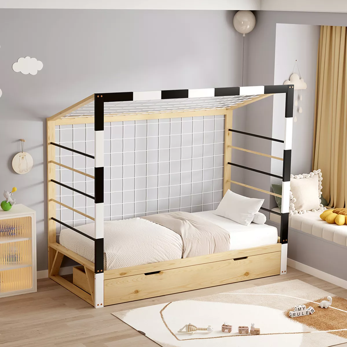 The GOALIE Montessori-type children's bed, in the size of a 90x190cm mattress, is made of pine wood. The bed is shaped like a football goal with a corresponding black and white color scheme and has a large drawer on wheels at the bottom for easy access, while the mattress is placed on plywood boards.