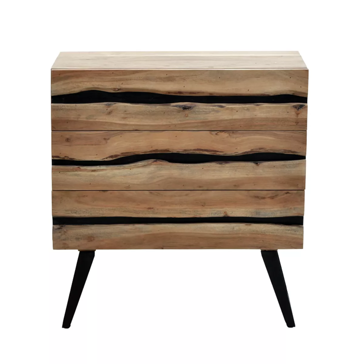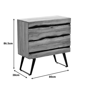 The Imena I Dresser masterfully combines the raw beauty of natural wood with a modern, industrial touch. Its standout feature is the striking "crack" that runs across its front, creating a unique visual interest and highlighting its organic character.