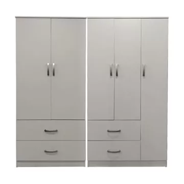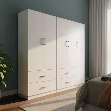 Includes five doors, featuring an internal rail for hangers and shelves, while the bottom section contains four large drawers for storing clothes and accessories.