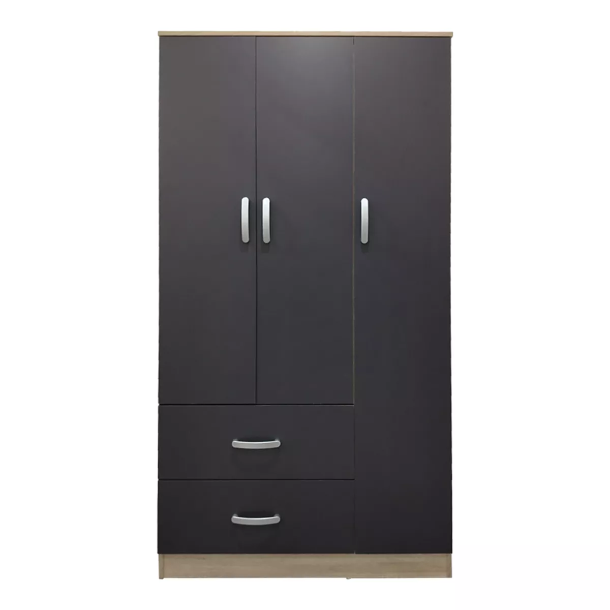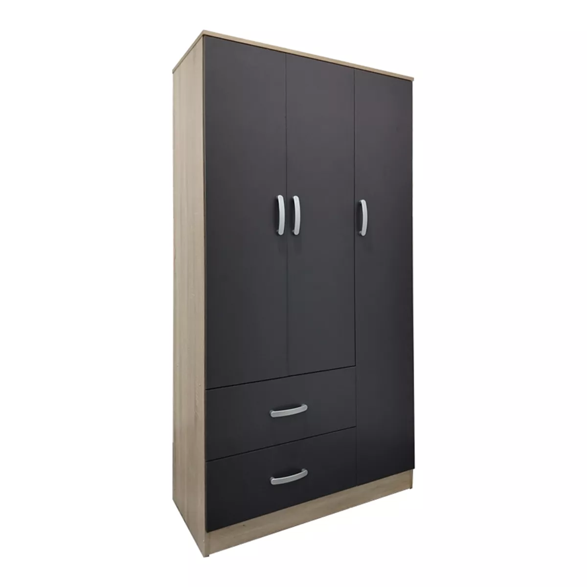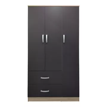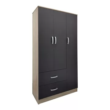 Includes three doors; the interior contains a hanging rail and shelves, while the lower section features two large drawers for storing clothes and accessories.
