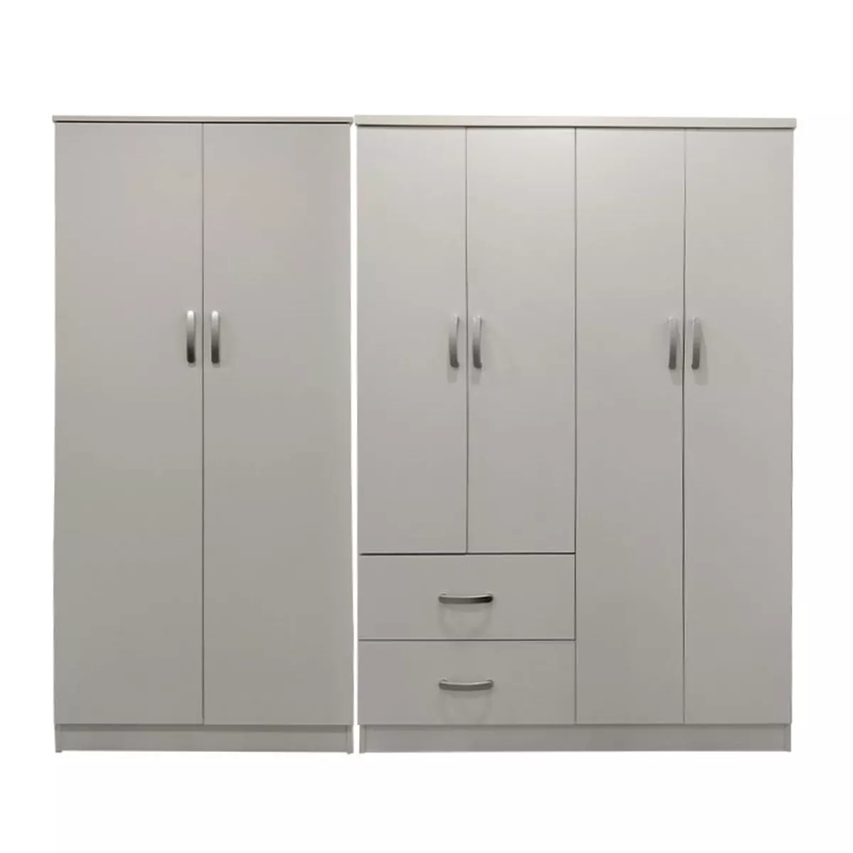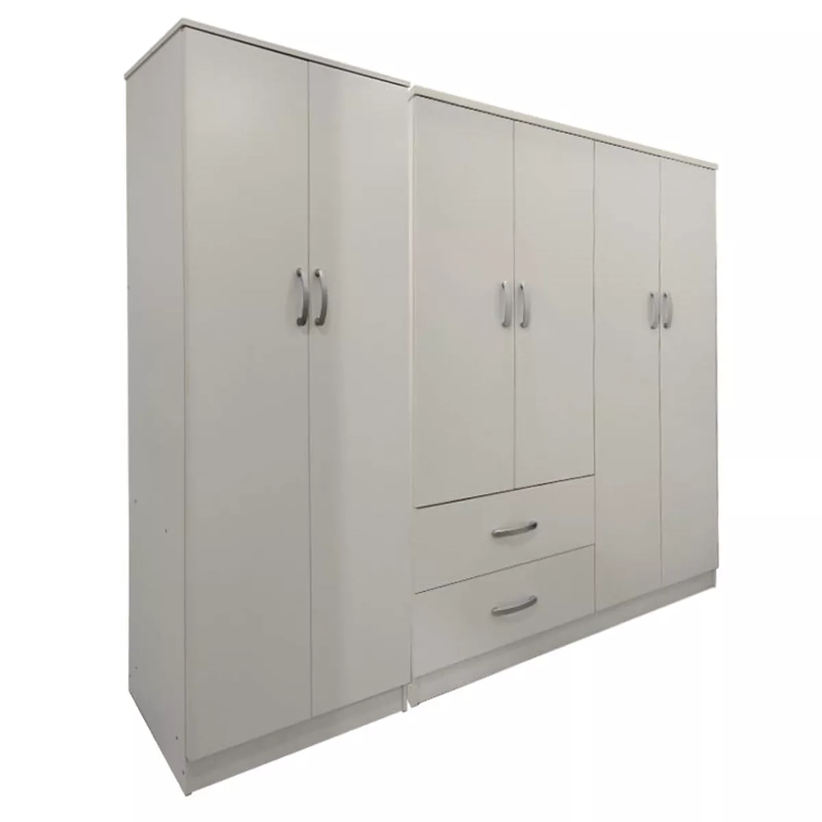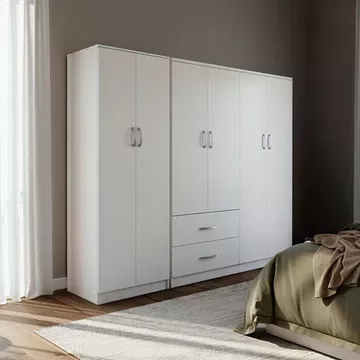 Includes six doors, featuring an internal rail for hangers and shelves, while the bottom section contains two large drawers for storing clothes and accessories.