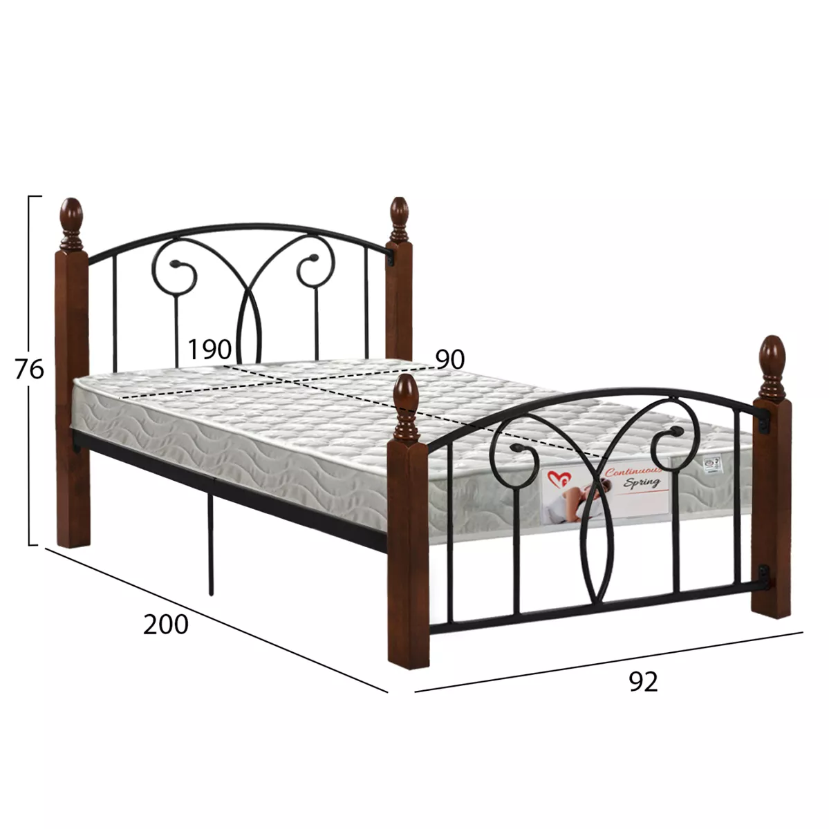 • The SUZIE bed in single mattress size is a composition of metal in BLACK color and wood in WALNUT shade. The 4 legs-pillars of the bed are the wooden pieces of the composition, while all the rest is metal.