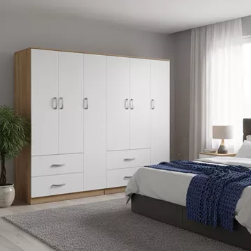 • Includes six doors; inside it features a rail for hangers and shelves, while at the bottom it has four large drawers for storing clothes and accessories.