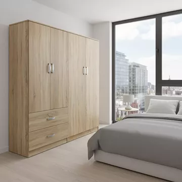 • Includes four doors; inside it features a hanging rail for clothes hangers, while at the bottom it has two large drawers for storing clothes and accessories.