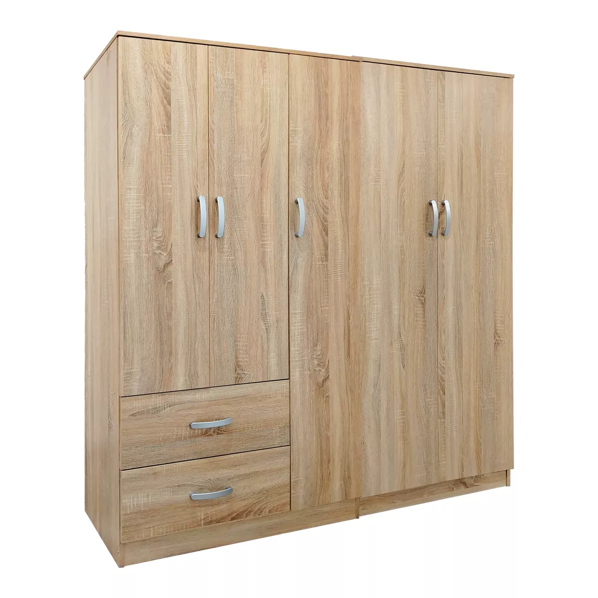 - Includes five doors, featuring an internal rail for hangers and shelves, while the bottom section contains two large drawers for storing clothes and accessories.