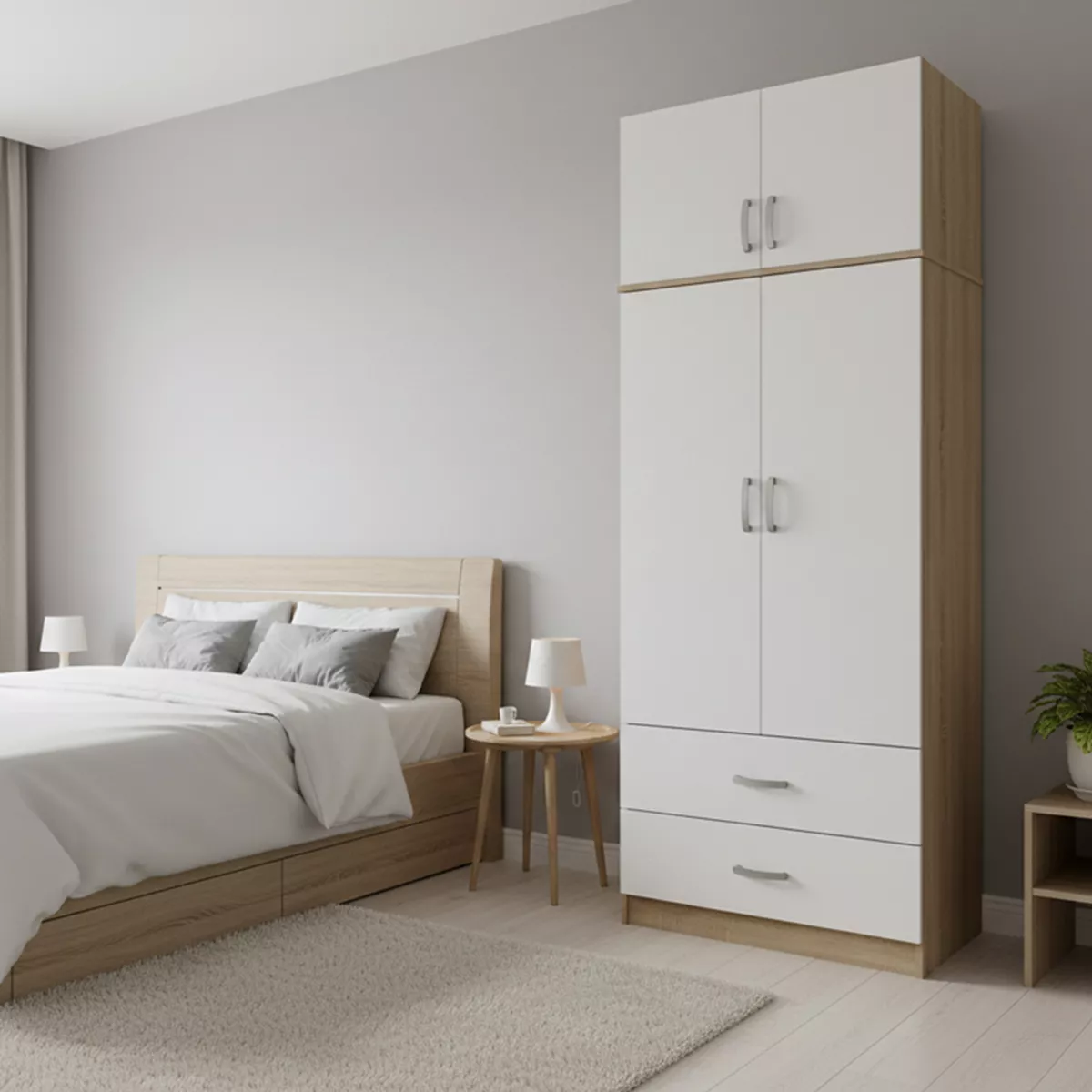 It features two doors; inside there is a rail for hangers, while the bottom section includes two spacious drawers for storing clothes and accessories.