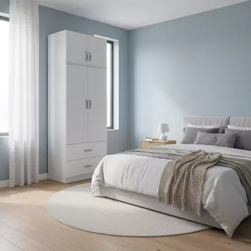 It includes two doors; inside, there is a hanging rail for clothes, while the bottom features two spacious drawers for storing garments and accessories.